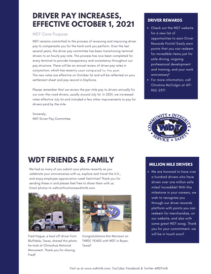 It's hard to believe we are nearing the end of 2021. Check out what to expect before the end of the year and some exciting things taking place at WDT! Open Enrollment will open November 1st; we have a TON of great feedback from all of our drivers we are still reviewing carefully and many other additions to our ongoing efforts to reward and recognize our fantastic team.